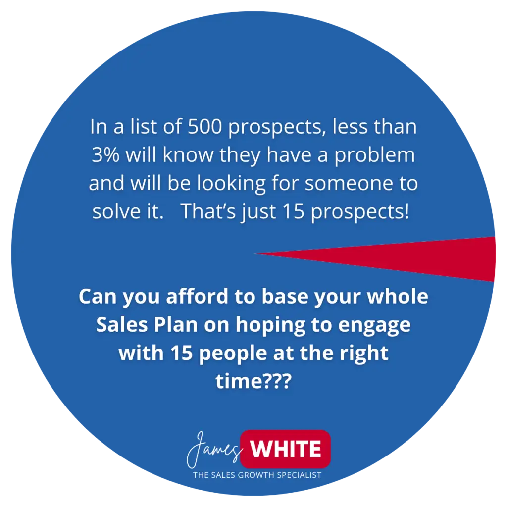 It’s not. In a list of 500 prospects, less than 3% will know they have a problem and will be looking for someone to solve it. That’s just 15 prospects! Can you afford to base your whole Sales Plan on hoping to engage with 15 people at the right time???