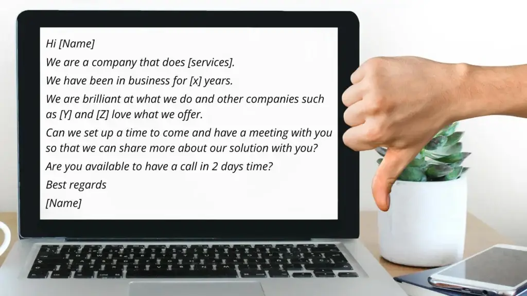 Please note – This is NOT the email or social message you should send. This type of email doesn’t work. It is selfish, without value and a waste of time and energy to create. Asking for time in the next few days as well (laughing faces smiley)