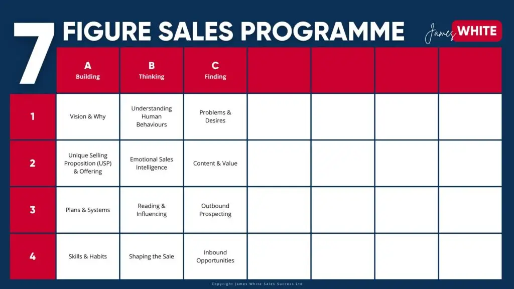 That’s a wrap for Step C: Finding! And finding the right prospects is yet another crucial step towards sales success. Whether it’s understanding their problems and desires, delivering value through content, prospecting proactively, or attracting them through inbound strategies, this step is essential to building your pipeline. In fact, all the steps in the 7-Figure Sales Programme are essential and should not be skipped.